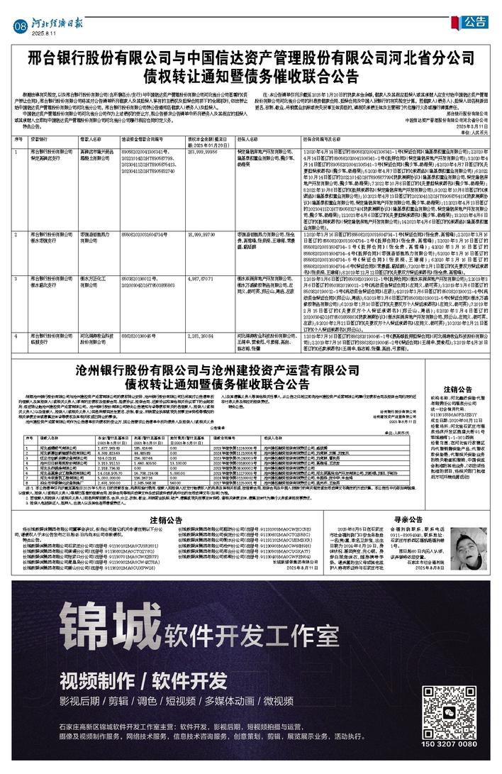 邢台银行股份有限公司与中国信达资产管理股份有限公司河北省分公司 债权转让通知暨债务催收联合公告