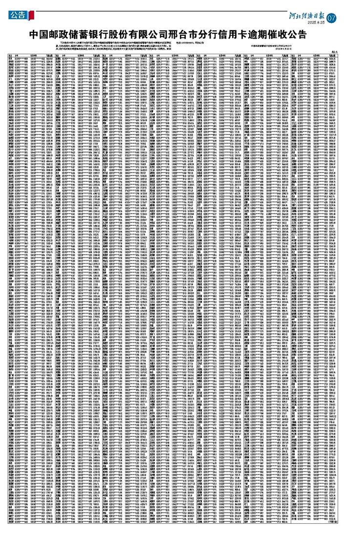 中国邮政储蓄银行股份有限公司邢台市分行信用卡逾期催收公告