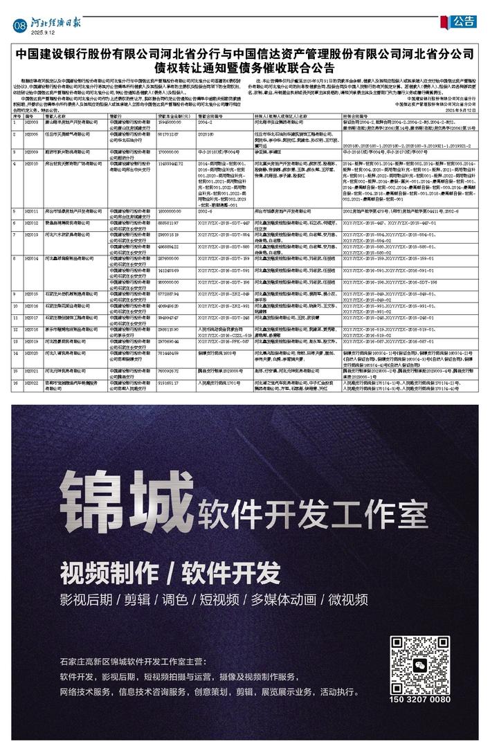 中国建设银行股份有限公司河北省分行与中国信达资产管理股份有限公司河北省分公司 债权转让通知暨债务催收联合公告
