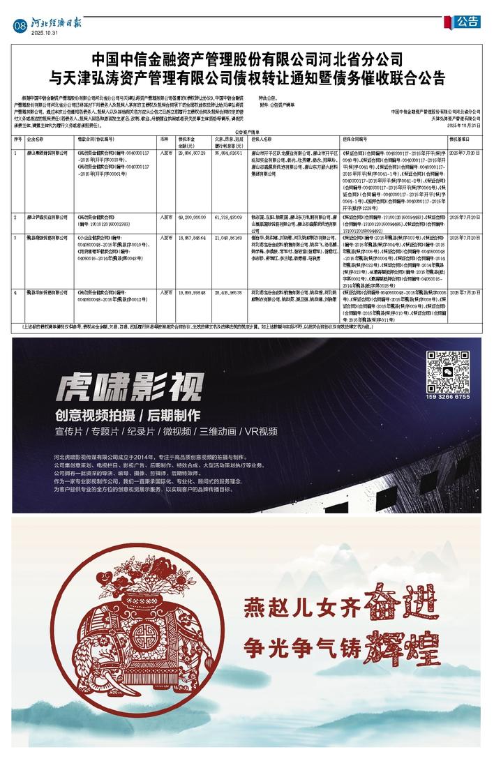 中国中信金融资产管理股份有限公司河北省分公司 与天津弘涛资产管理有限公司债权转让通知暨债务催收联合公告