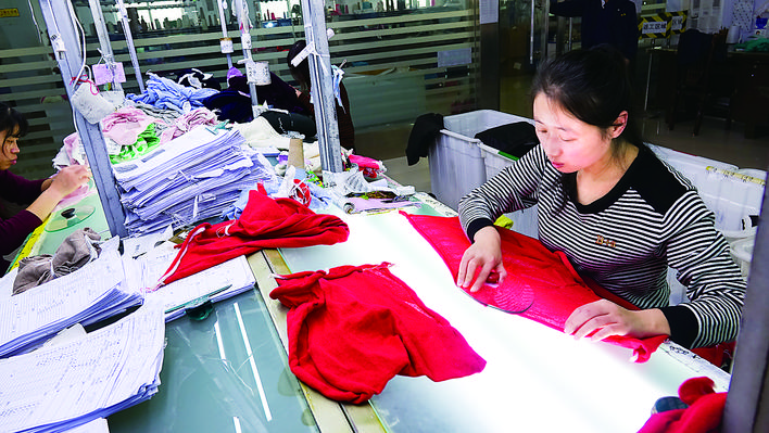 工人正在检查羊绒衫片的质量。记者 吴新光 摄