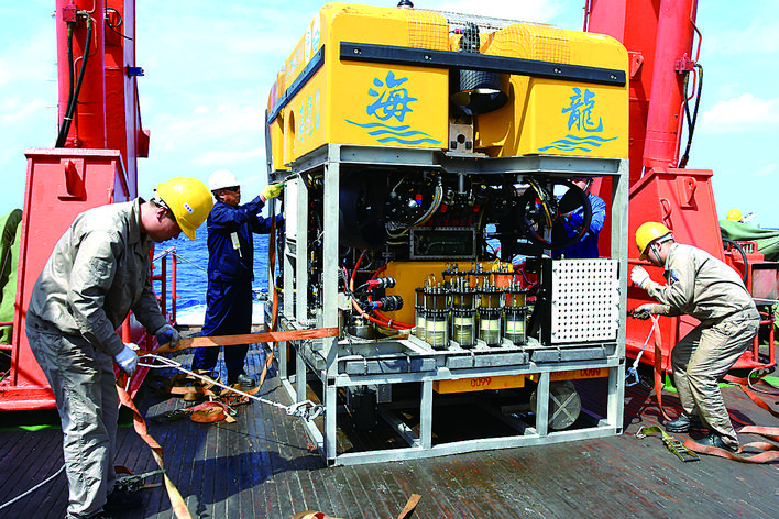 当日,中国“海龙Ⅲ”潜水器由“大洋一号”科考船搭载,在西太平洋海域完成首次深水试验,抵达1690米深的海底。新华社记者 陈灏 摄