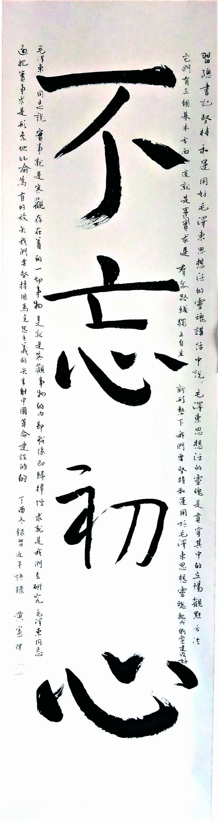 黄宪律自称是书法爱好者,但笔者看来“这位爱好者”是下了功夫的,是真正的学者型书画家。纵观黄绮的款跋大都是谈文字和书写及与之相关的诗词。黄宪律的款跋全都是做人做事思想性内容很强的诗词对联,除长篇大论的书法论文之外,在书法作品上谈古论今,却从不谈书法创作体会。他总是书写他自己内容的作品,即使别人要求写“家和万事兴”,他也要改成“协和家兴”或“和谐兴家”或“万兴家和”然后款跋,“篡改”古人成语的“相关关系”和“所指关系”。按黄宪律自嘲说法:“我这是‘新文人’书法爱好者的思想展现。”
