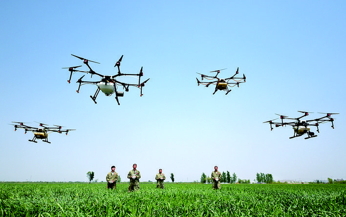 五月六日,农业植保人员在故城县郑口镇东北屯村麦田操作植保无人机喷洒农药。 眼下正值小麦“一喷三防”的关键时期,故城县农业部门引导农民强化麦田科技管理,利用植保无人机对小麦进行大规模喷药作业,提高了麦管作业效率,确保夏粮丰收。新华社记者 朱旭东 摄