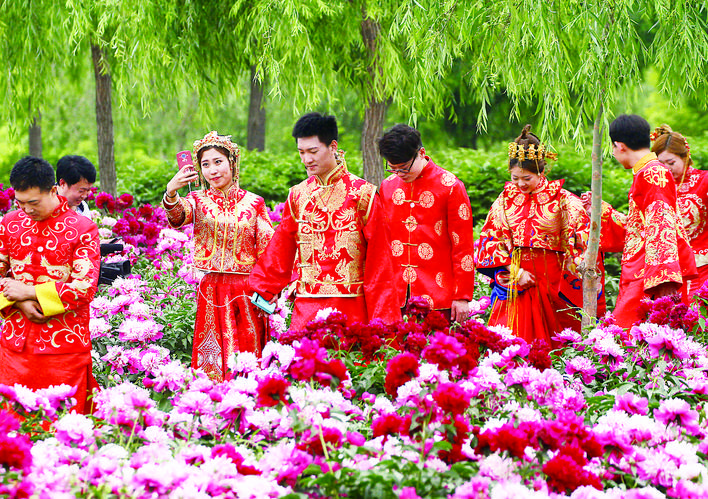 5月15日,16对身着旗袍的新人在易县狼牙山牡丹园内喜结连理。这次“中国风”的集体婚礼不仅让他们体验到中国传统婚礼的文化,更为他们今后的婚姻生活增添了别样色彩。 郭诚 摄