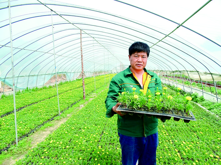 围场满族蒙古族自治县龙头山镇,通过产业谋划、产业扶持、拓宽路子等渠道,大力推行“党建+产业”发展模式,推动党建工作与精准扶贫同频共振。该镇“顺鑫果蔬种植专业合作社”以迎接第三届省旅发大会为契机,因地制宜发展特色花卉产业,栽植25万盆万寿菊、70万株牵牛花和鼠尾草,花卉销往御道口牧场等地,促进了农民增收。图为合作社社员李梦臣在观察盆栽万寿菊的长势情况。 王东岭 张云娇 摄