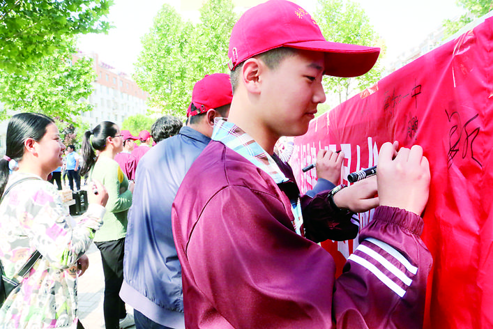 近日,南和县举行“衣旧情深·文明和阳”公益项目暨社区志愿服务月活动启动仪式。来自该县县直各单位和学校青年志愿者等200余人将旧衣物放进了旧衣回收箱,并在“文明和阳你我同行,全民共建文明县城”条幅上签名,践行绿色理念、弘扬文明新风。国欢欢 摄