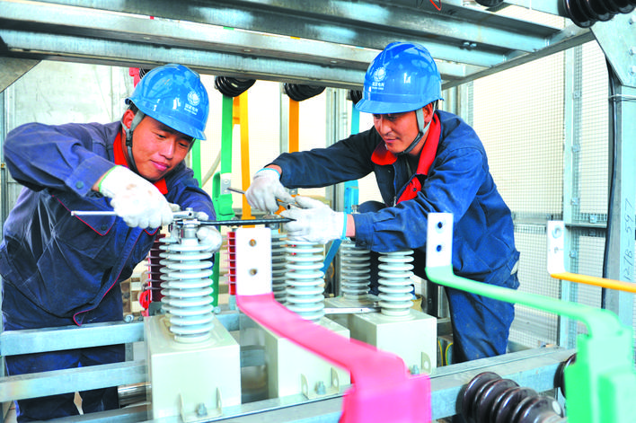 近日,邢台县供电公司员工对35千伏袁庄变电站进行增容改造,图为供电员工对电容器组进行更换。