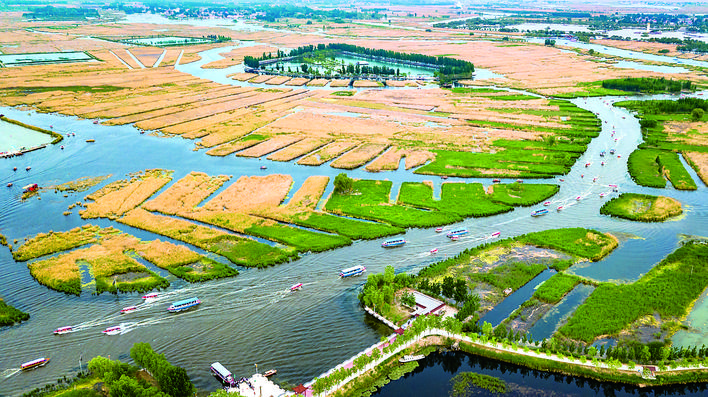 图为游人乘坐游船欣赏白洋淀的美景(无人机拍摄)。 位于河北雄安新区境内的白洋淀景区风景秀丽、环境宜人,吸引不少游客前来欣赏游玩。新华社记者 沈伯韩 摄