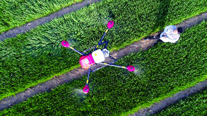 近日,在一片绿油油的农田上,遥控无人机正在喷洒肥料作业。马头营镇是乐亭县传统的水稻种植大镇,也有相当面积的小麦田。以前农户施叶面肥、喷洒农药全靠手工操作,费时费力且会导致覆盖不到位或重复喷洒,还可能会对人体产生一定毒副作用。自2017年开始,该镇利用成功牵手极飞集团(无人机科技公司)的机会,在全县率先建立植保无人机基地,打造智能化农业。檀军 张野 摄