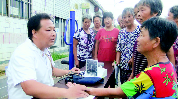 日前,行唐县翟营乡卫生院组织医务人员成立志愿者小分队,走进贫困村——沟北村开展中医防治夏秋交替季节易发疾病宣传义诊活动,现场讲解夏秋交替季节易发高血压病、中风、冠心病、心肌梗塞和腹泻等疾病中医防治常识。图为志愿者正在为群众脉诊。赵牾牛 摄