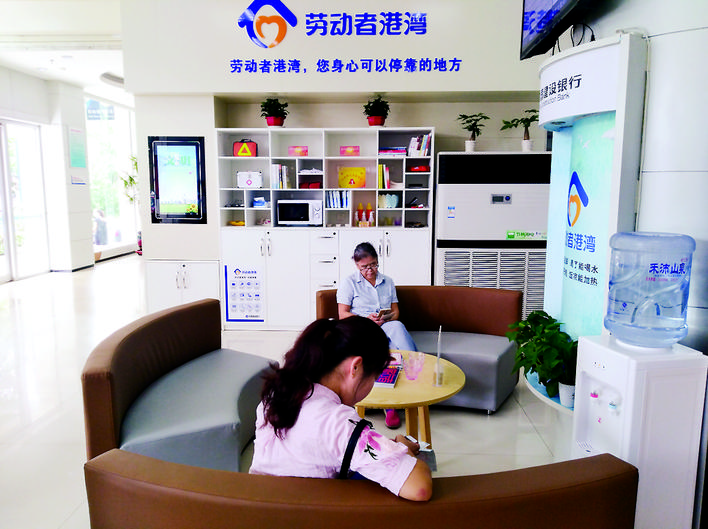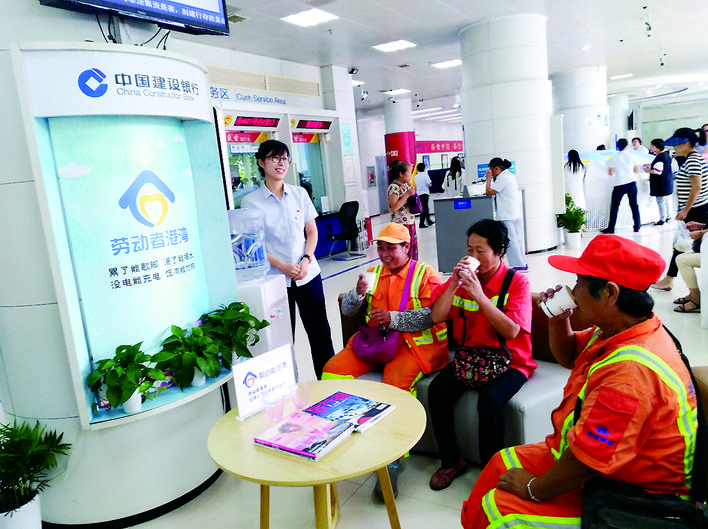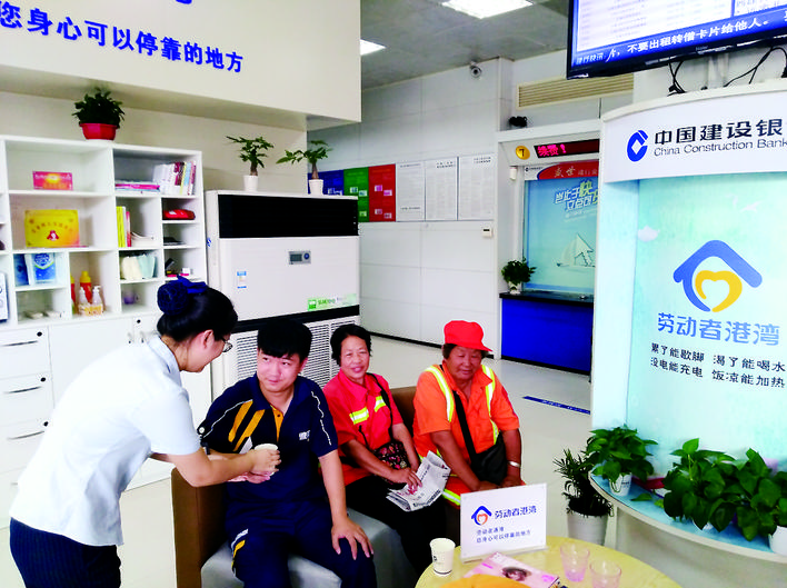 “劳动者港湾”根据网点实际面积、功能配置等情况,为大众提供饮水机、休息座椅、点验钞机、Wi-Fi、老花镜、雨伞、急救包、手机充电器等多项便民服务设施,重点为环卫工人、出租司机、交警、快递员、志愿者等户外工作者,老弱病残孕、走失儿童、考生等需要特殊关爱的群体,以及其他有需求的社会公众提供临时休息、饮水、手机充电、避暑御寒、考生服务、爱心救助等多项温馨、周到的非金融服务。