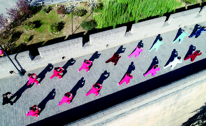 10月15日,宣化区200多名老年太极拳爱好者在古城墙上打起太极拳,用登高健身的方式喜迎重阳节到来。 陈晓东 摄