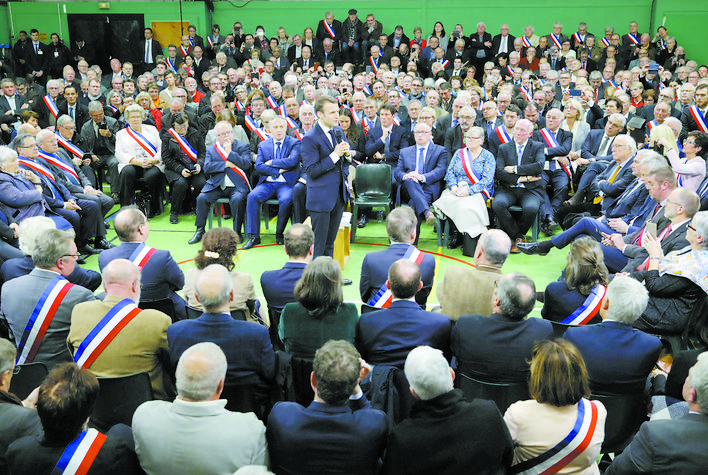 1月15日,在法国西北部厄尔省,法国总统马克龙(中)在与数百名市长的集会中发言。据法国总统府消息,马克龙在厄尔省和来自诺曼底大区的数百名市长就公务员体制改革、税收改革、财政支出等多个议题进行了长达约7小时的探讨,以这种形式开启全国辩论。新华社/美联