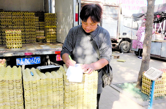吕保民的妻子赵敏卿在自家摊位前卖鸡蛋。 刘澜澜 摄