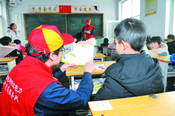 2月22日,邢台县供电公司共产党员服务队来到王快镇北屋小学,开展安全用电进校园活动,为那里的师生送去了一堂别样的“电力课”。图为邢台县供电公司员工正在向孩子们介绍安全用电知识。潘龙 摄