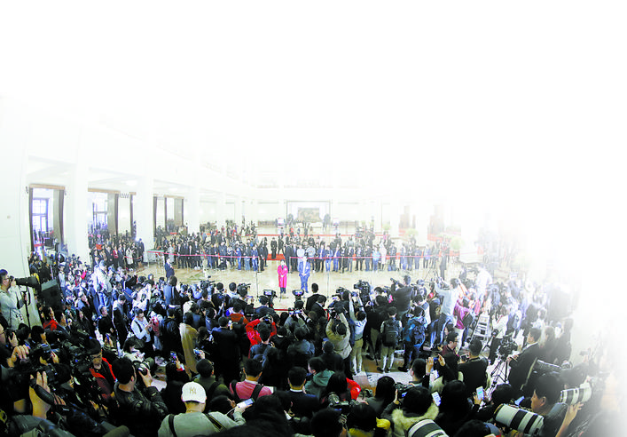 掌声、笑声、快门咔嚓声……3日下午,人民大会堂中央大厅北侧,全国政协十三届二次会议首场“委员通道”引发中外媒体高度关注。