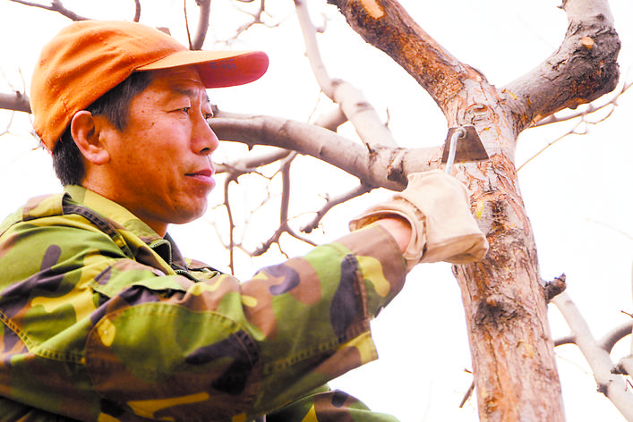 近年来,怀来县狠抓名优果品基地建设,使果品产业化逐步向品种名优化、管理标准化、生产无公害化、果品优质化的方向发展。到目前,全县林果总面积达到32.3万亩,带动农民增收致富。图为该县草庙子村果农在修剪果树。孙慧军 摄