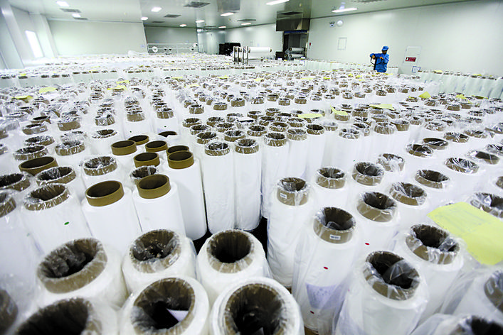 上图:在中国乐凯集团锂离子电池隔膜生产车间,工作人员正对隔膜表观质量进行检验。 罗大庆 摄