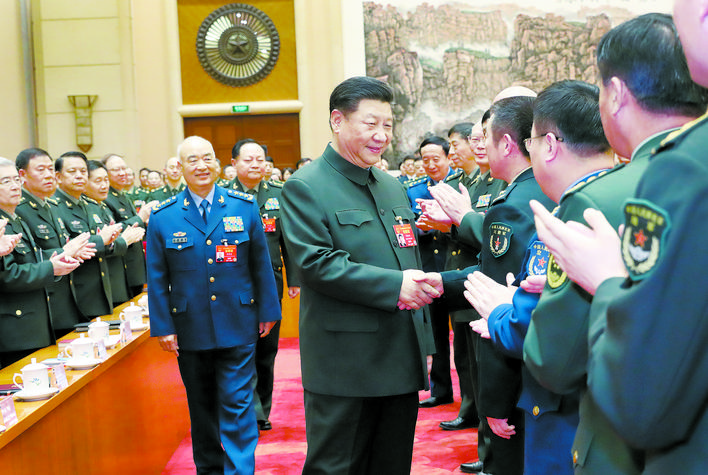 3月12日下午,中共中央总书记、国家主席、中央军委主席习近平出席十三届全国人大二次会议解放军和武警部队代表团全体会议并发表重要讲话。这是会议开始前,习近平亲切接见与会代表。新华社记者 李刚 摄