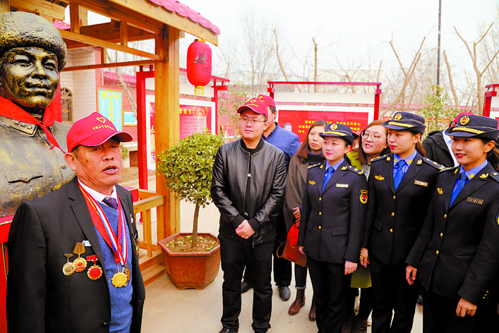 为深入开展学雷锋活动,日前,枣强县住建局组织20名志愿者到枣强镇杜烟村谷殿明学雷锋教育基地参观学习,倾听谷殿明老人(左一)讲述自己学雷锋的故事和基地的发展历程。 杨双池 何秋红 摄