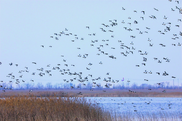 近日,渤海新区南大港湿地迎来了大批迁徙候鸟。成群的灰雁、天鹅、白鹭、野鸭等鸟类,时而展翅翱翔于天际,时而在水面扎堆聚集,场面蔚为壮观。 刘全胜 摄
