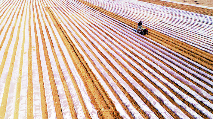 眼下,丰润区各地陆续进入春耕春播春管的农忙时节。图为3月19日,丰润区任各庄镇光新庄子村农民在播种土豆。朱大勇 邢丁 摄