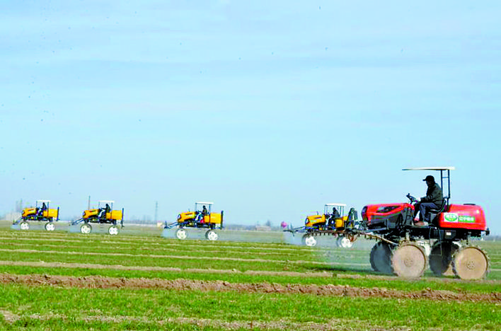 为做大做优藁城藁优麦特色品牌,藁城区坚持发挥优势、突出特色、整乡打造、全区推进的原则,在阳台、梅花等8个村集中连片建设了3.08万亩强筋麦核心示范区,辐射带动全区藁优系列强筋麦品种种植面积43万亩,普及率达到87.8%,有力推动了小麦绿色高质高效建设。图为自走式喷药机正在进行“一喷综防作业”。 索军杰 摄