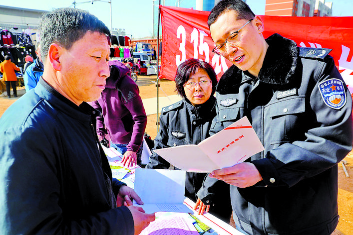 近日,海港区农业农村局工作人员走进杜庄镇大集开展“3·15农资打假进乡村·护农为民保春耕”活动,发放《农药管理条例》等宣传材料,增强百姓辨别真伪的意识,为春耕备耕提供有力的保障。 曹建雄 摄