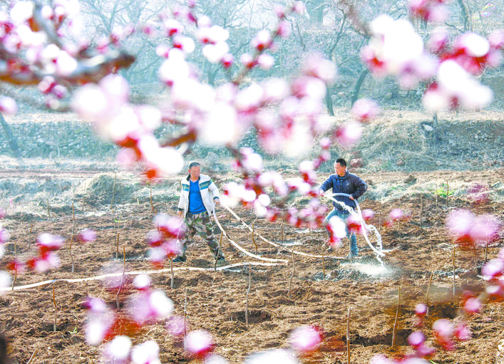▲3月27日,遵化市新店子镇君子口村村民给新栽幼树浇水。 新华社发(刘满仓摄)