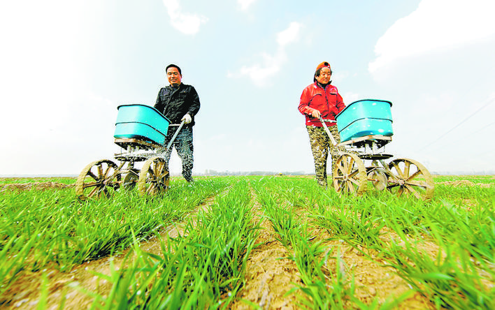 ▲3月27日,武邑县武邑镇蔡徐村农民在麦田施肥。 新华社记者 朱旭东 摄