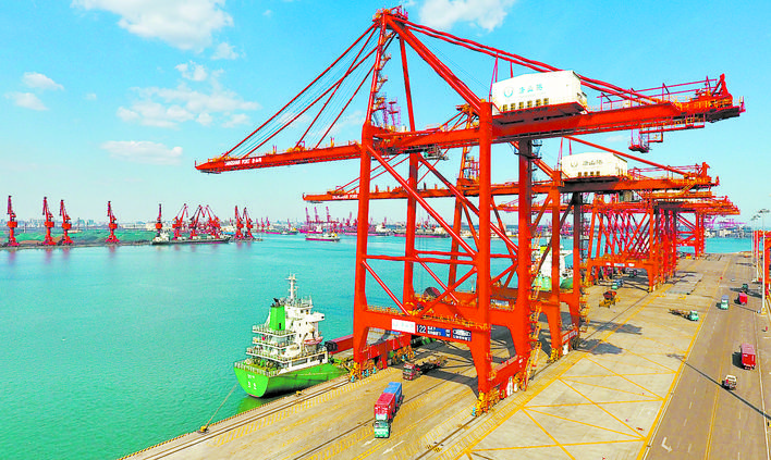 3月27日,轮船靠泊在唐山港京唐港区集装箱码头装货。