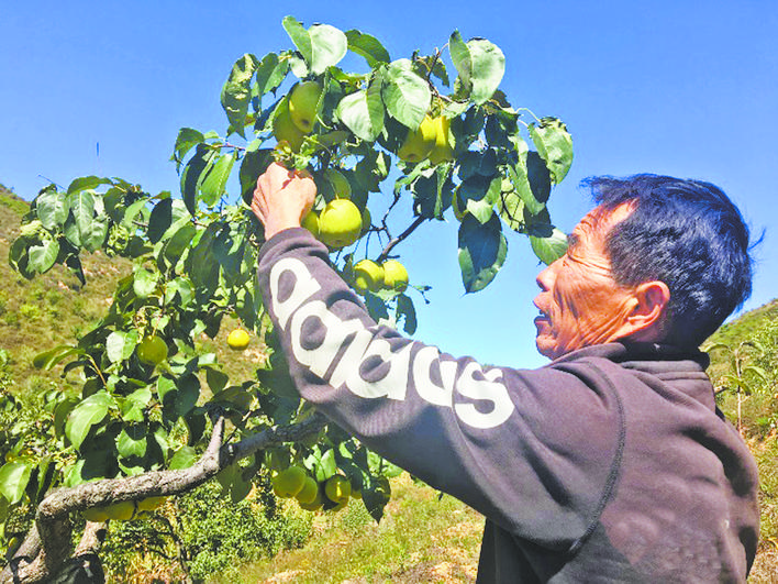丰宁满族自治县波罗诺镇官梁村的村民吴连贵正在采摘丰收的秋梨。李国伟 摄