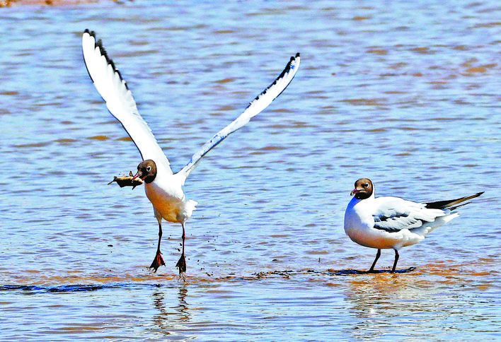 随着天气转暖,成群的海鸥、苍鹭、白鹭等候鸟飞临张家口城区洋河段栖息,给清澈的水域增添一抹生机活力。多种候鸟翔集塞外,迎接春天的到来,构成一幅人与自然和谐相处的优美画卷。图为两只海鸥在洋河捕鱼。 记者 任光阳 通讯员 武殿森 摄