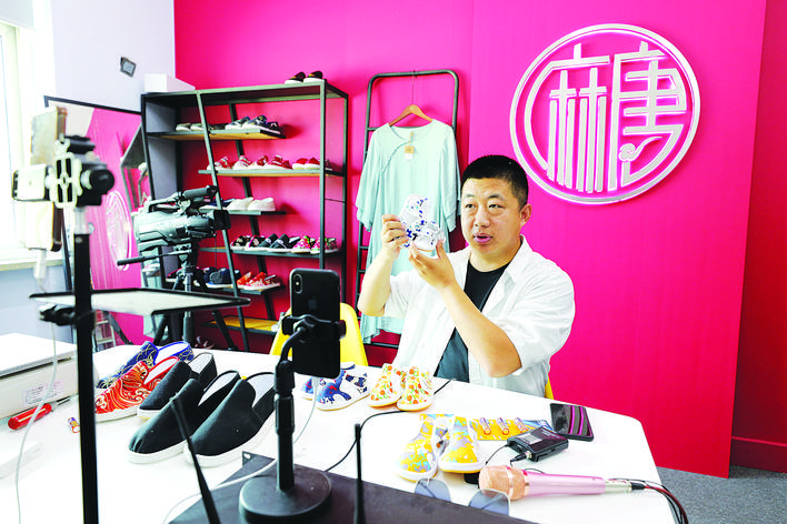 在武邑县电商大厦,主播通过网上直播介绍手工布鞋。