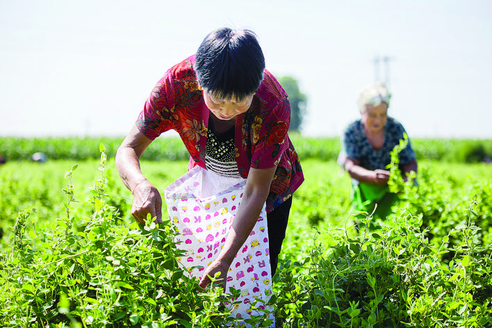 武邑县审坡镇李小庄村村民在采摘金银花。