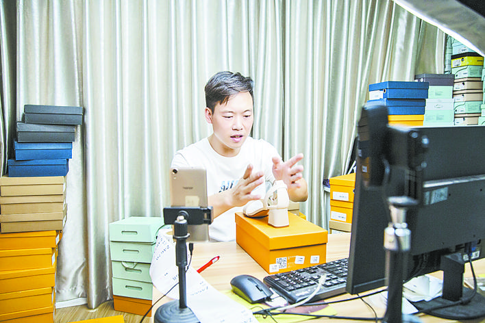 在四川阿么鞋业办公区,10个直播间显得格外忙碌。男主播赵映财站在补光灯支架前推销着一款女鞋。半年前,他只是公司一名库房搬运工,受疫情影响面临无活可干的困境。