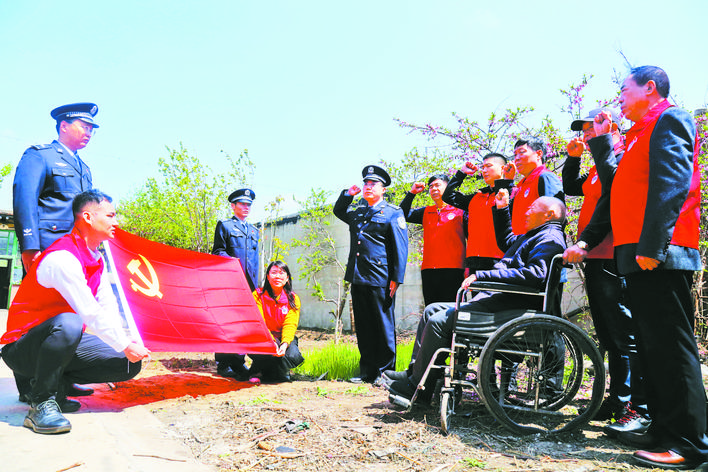 日前,省公安厅海防管理总队唐山支队王滩海防派出所党支部与唐山市近海救援志愿者协会党支部联合开展党史学习教育实践活动,邀请参加过解放战争、抗美援朝战争的老战士、老党员李景昌老人,为警民党员上了一堂生动的党史课。活动期间,警民党员代表还和老人共同重温了入党誓词。张立伟 杨卫星 邢丁 摄