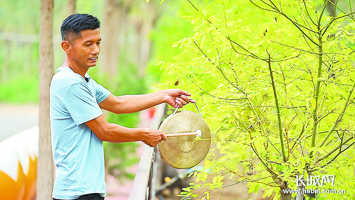 穆高峰敲锣喂猪。 记者 冯硕 摄