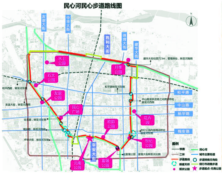 据介绍,此次改造工程沿民心河南线、西线、北线、东线全线贯通,形成环网,总长度34.5公里,步道宽度2.5米至3米,通过彩色沥青与混凝土进行铺设,工程串联民心广场、友谊公园、石太公园、水上公园、月季公园、花卉园、世纪公园、富强公园、欧韵公园,最终再回到元南公园,共计串联10座公园(广场)。