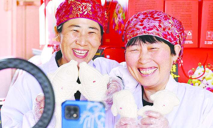 春节临近,黄骅市有过年蒸面花的习俗,面花要经过揉面、搕花、晾花、饧花、蒸花等十多道工序制成鱼、寿桃、十二生肖等形状,口感筋道,造型美观。2009年,黄骅面花制作技艺列入河北省级非物质文化遗产保护名录。图为相关工作人员在直播带货。崔上 苑立伟 摄