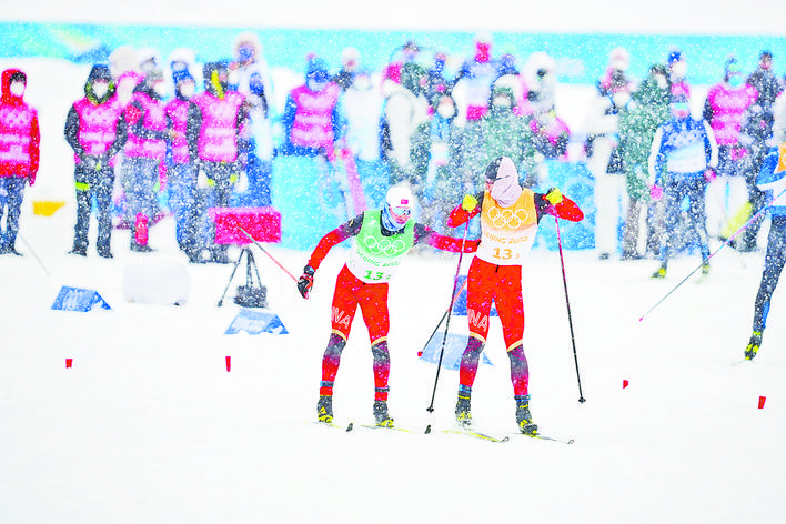 中国运动员张洋铭、徐铭甫13日在高山滑雪男子大回转中冒雪完赛。赛后张洋铭直言,虽然自己和世界顶尖选手还有不小差距,但他享受和各国(地区)运动员在雪中一同拼搏的感觉。