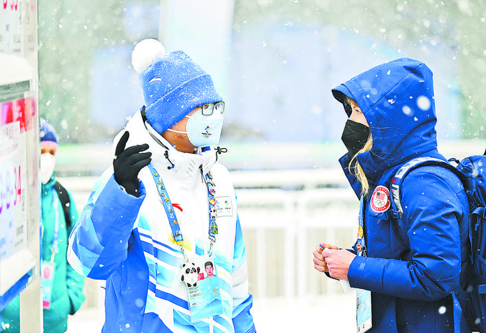 2月13日,一名班车引导员志愿者(左)在北京2022年冬奥会和冬残奥会主媒体中心摆渡车站点前为一名外国工作人员提供咨询服务。