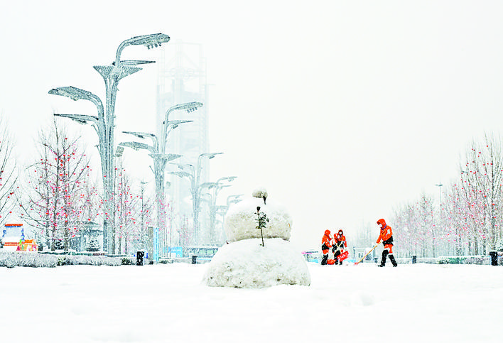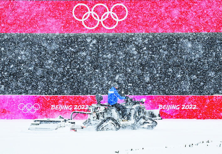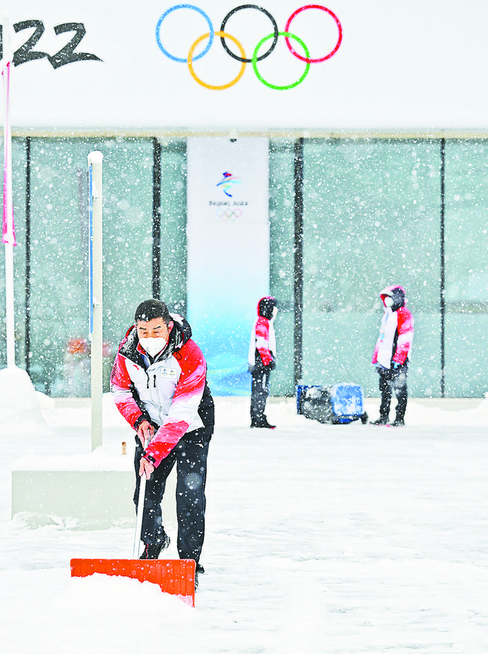 2月13日,工作人员在北京2022年冬奥会和冬残奥会主媒体中心外的区域清扫积雪。