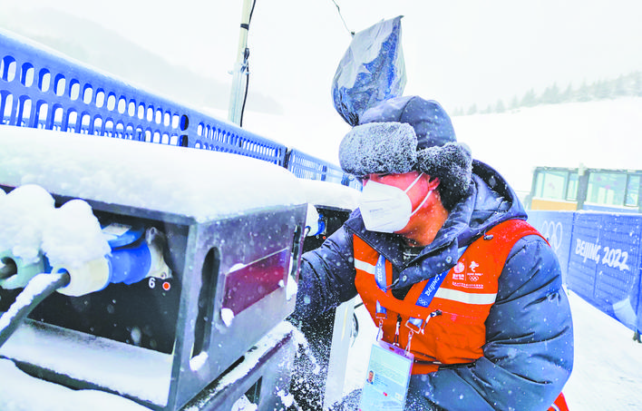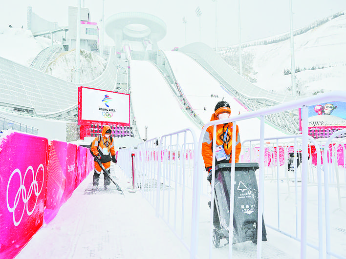 2月13日,国家跳台滑雪中心赛场内,工作人员在清理积雪。