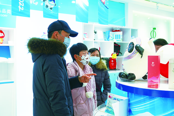 随着北京冬奥会的开幕,毛绒玩具、纪念徽章、摆件等冬奥特许商品在石家庄迎来销售高峰。图为市民在石家庄市的北京2022官方特许商品零售店内选购商品。康义涵 摄
