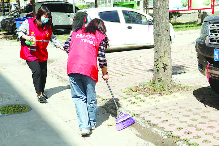 张北县委宣传部党支部成员在包联小区清扫路面。 吴孟忱 摄