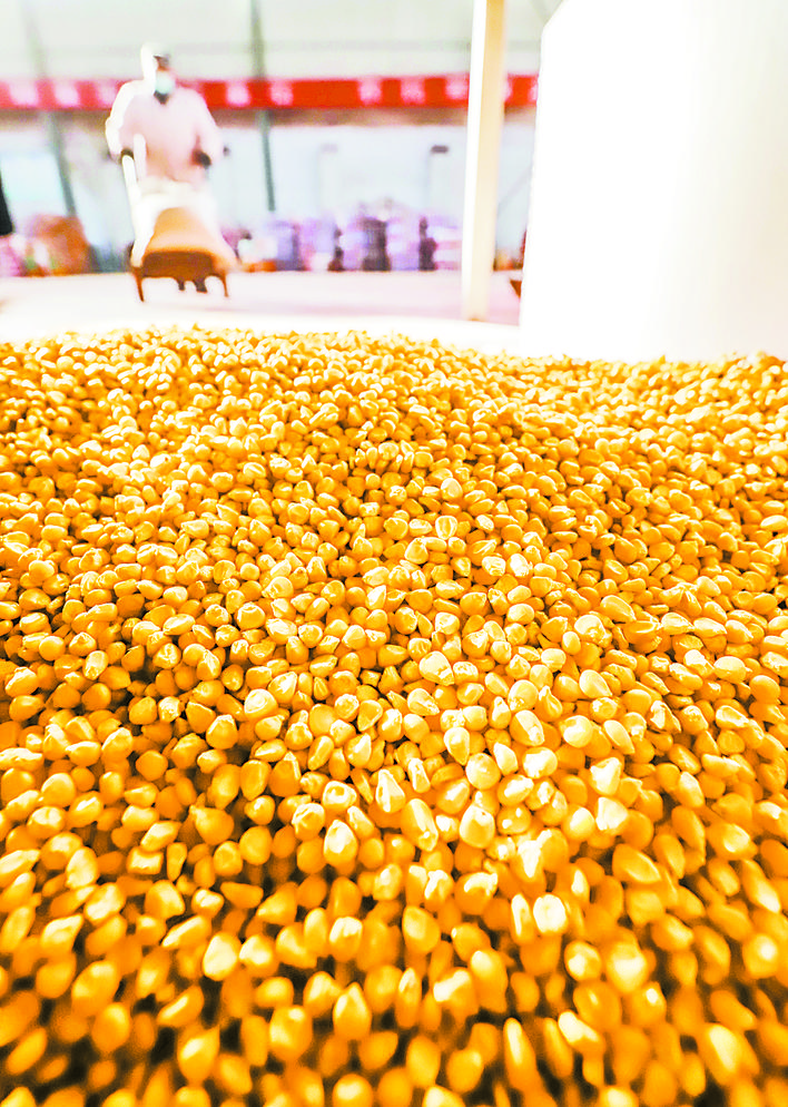 →图为工人在河北省遵化市一家种子公司运送玉米原种,准备精选灌装。