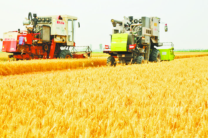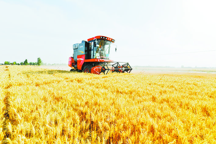 6月7日,农户驾驶大型收割机在石家庄市栾城区南高乡前庄村收割麦子。