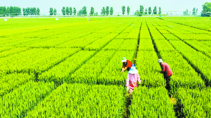 ↑图为农民在河北辛集市马兰农场节水小麦田里劳作。